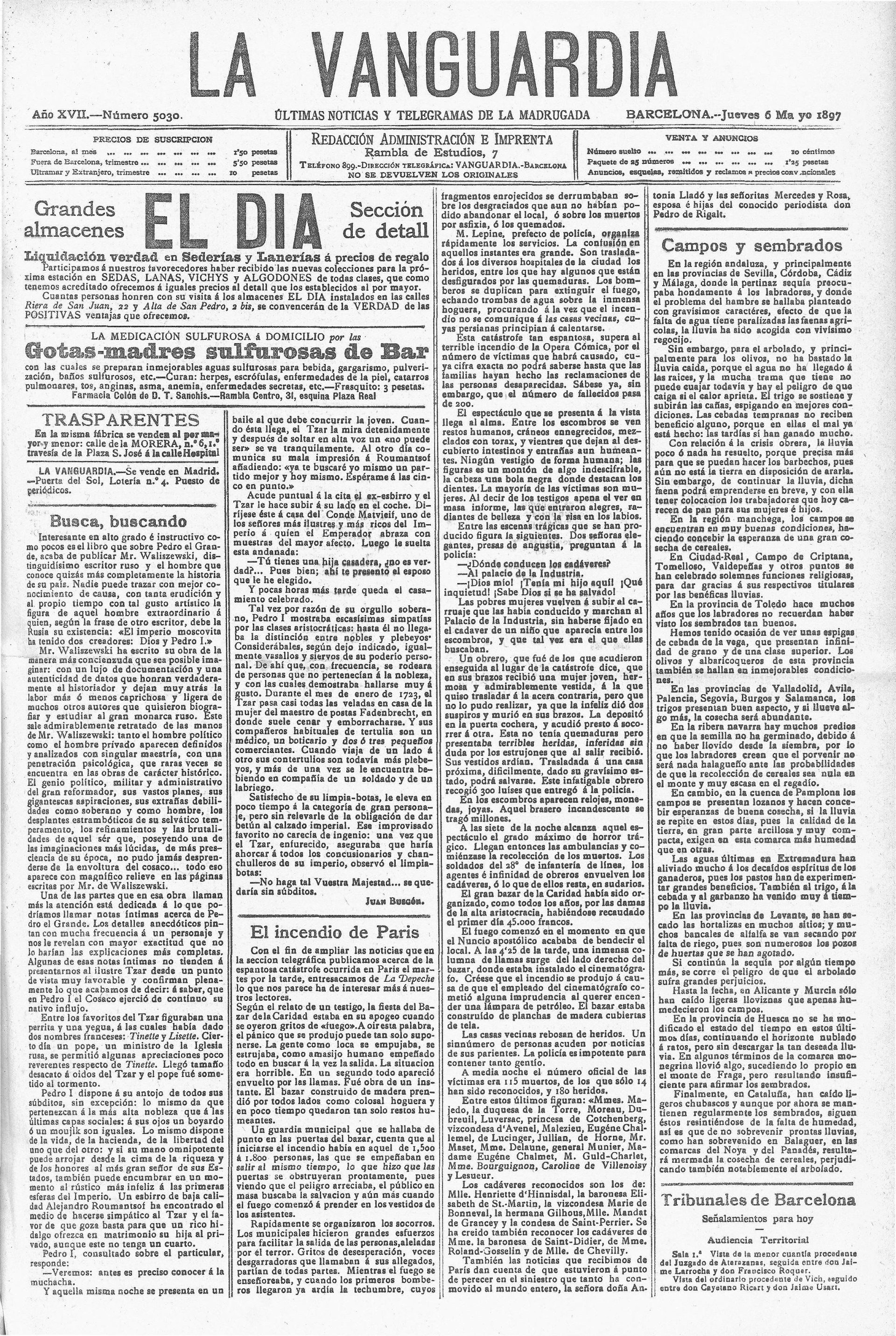 Curiosidad: El bazar estaba construido de madera de pino. Había un escenario que representaba una calle de París en la Edad Media. El incendio quemó la lona del escenario. Posteriormente, el fuego llegó hasta el techo de alquitrán que cubría el bazar. La rapidez en la propagación del incendio, hizo que las personas entraran en pánico y se pisa las unas a las otras a la hora de evacuar el bazar. El lugar sólo tenía dos salidas. En 15 minutos, el fuego devastó completamente el bazar.