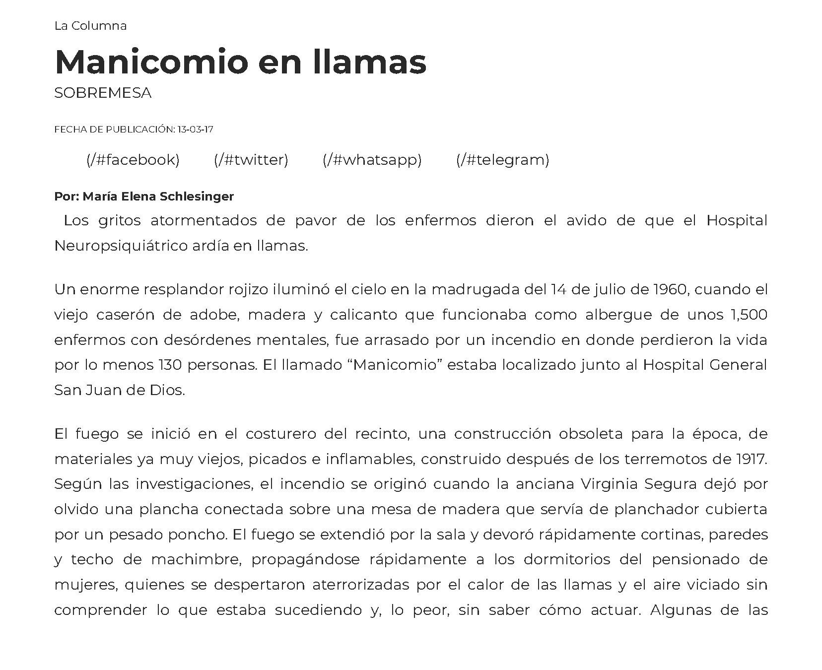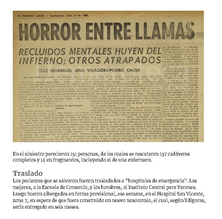 Curiosidad: El incendio afectó, en un primer momento, una estancia con casi 500 mujeres. Muchas de ellas quedaron atrapadas sin poder salir. Los pacientes evacuados deambulaban por el patio central y otros, pudieron salir y caminar por la ciudad. Muchos pacientes fueron trasladados a otros hospitales. En las tareas de rescate, estaban los bomberos y personal de la Cruz Roja