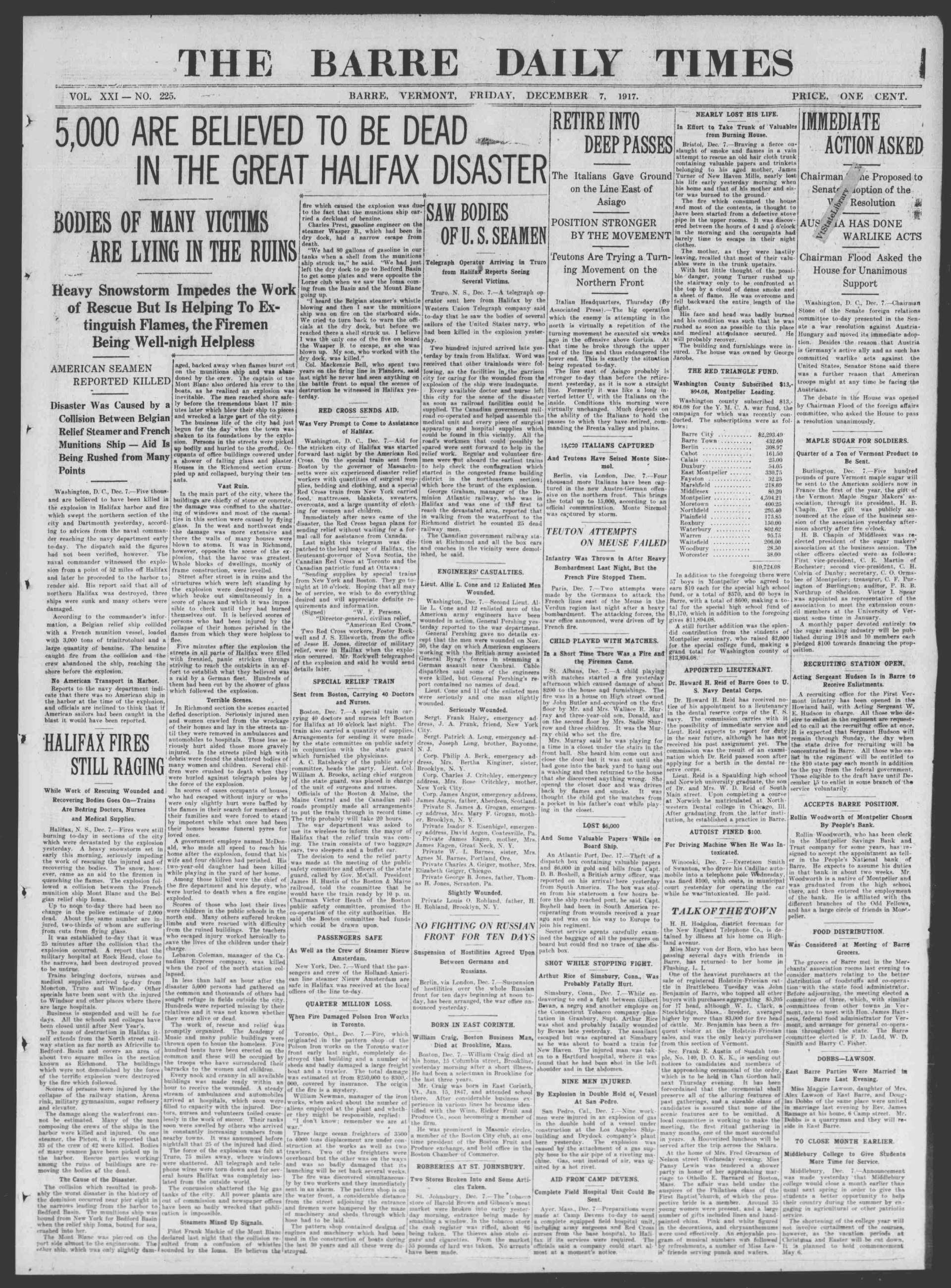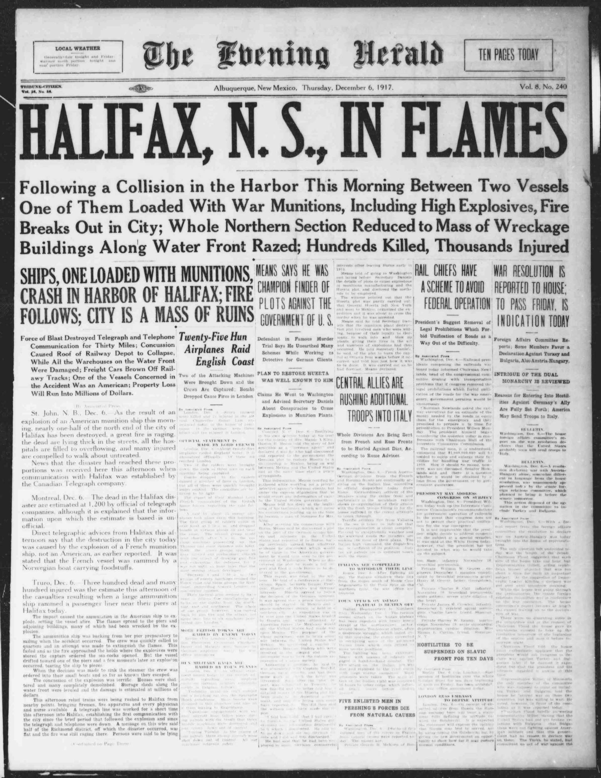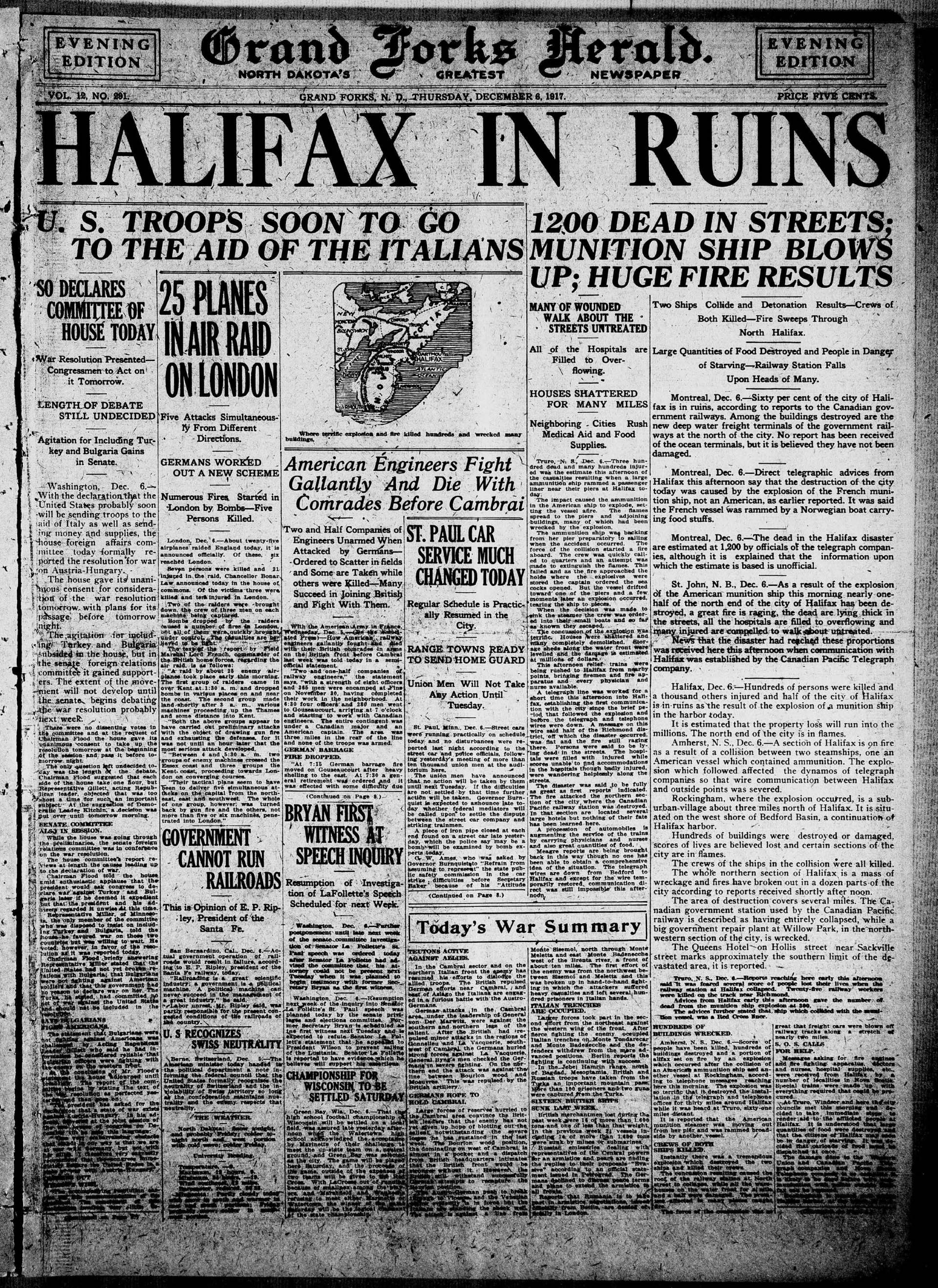 Causes de l'incendi: Col·lisió entre el buc de càrrega francès SS Mont-Blanc (TNT, àcid pícric, benzol) i el vaixell de vapor noruec SS Imo